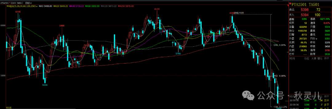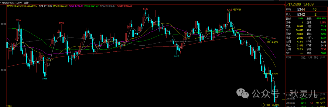 很多品种5月份那次铜逼仓事件就开始下跌了,而PTA硬多横盘了两个月,7月份,我都以为它要向上突破了,它才慢慢悠悠的开始跌,2409合约的这波告别跌的很流畅的。连累的TA2501合约跌了12.12%。